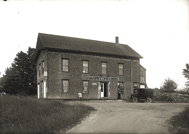 Comments from a meeting of the Hope Historical Society in 2010: L.A.Weaver store @ Hope Corner. 1924-1936 was period of Weaver ownership [Faith Hart] Note vehicles, wooden wheels, Model T Ford (?), gas pump.