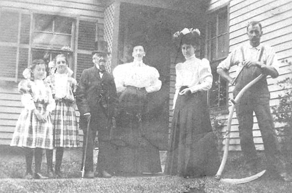 List on the back of the picture: Right to left - Uncle Charles Marriner?, Aunt Alice, Aunt Mamie?, Uncle Abner Dunton, Hope? Libby Payson, Elianor? Libby Pease?