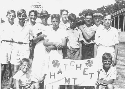 Hatchet Mt. 4-H Club of Hope Comer at Field Day held at Union Fairgrounds about 1938. By 1944 most of these boys were in service in WW II. Back row: Wilfred Hobbs, Vinal Hardy, James Wentworth, Mrs. Bessie Hardy leader of the club, Elroy Beverage, Jr., Dana Herrick, Jr..Royce Wright, Robert Wright, Jenness Eugley, Fred Brownell. In front holding banner: William True and Philip Wentworth.